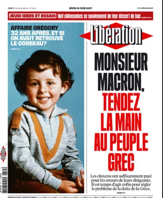 «Κύριε Μακρόν, δώστε το χέρι στον ελληνικό λαό» είναι ο πρωτοσέλιδος τίτλος της σημερινής «Liberation» που αφιερώνει πέντε σελίδες στο θέμα του ελληνικού χρέους και στο σημερινό Eurogroup στο Λουξεμβούργο.