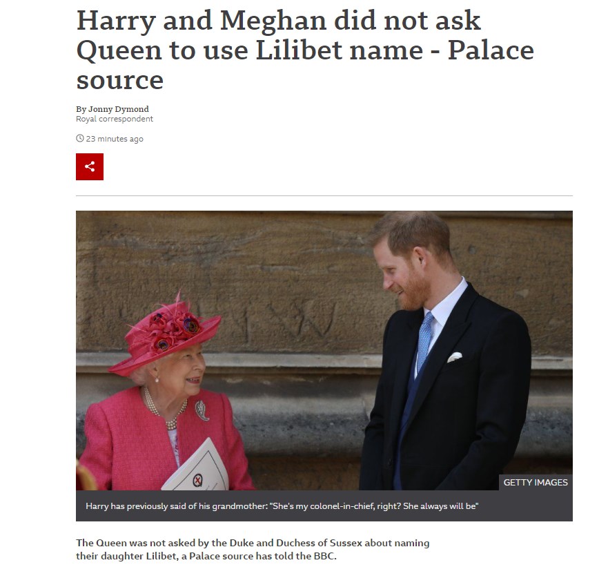 Λίγο μετά τη γέννηση του μωρού πηγές κοντά στο ζευγάρι είπαν ότι είχαν συμβουλευτεί τη βασίλισσα και γιαγιά του Χάρι πριν ανακοινώσουν το όνομα. Ο ισχυρισμός κοινοποιήθηκε ευρέως και δεν είχε αμφισβητηθεί μέχρι σήμερα το πρωί, όταν ανώτερες πηγές του παλατιού είπαν στο BBC ότι “δεν ζητήθηκε ποτέ η γνώμη της για την απόφαση του ζευγαριού”.