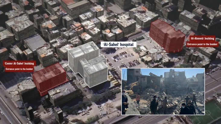 Το Ισραήλ δεν παρείχε αποδείξεις για την υποτιθέμενη αποθήκευση χρημάτων κάτω από το νοσοκομείο, αλλά δημοσίευσε γραφιστικό υλικό που δείχνει ένα καταφύγιο κάτω από το νοσοκομείο Σαχέλ και δήλωσε ότι είχε χρησιμοποιηθεί προηγουμένως ως κρυψώνα για τον πρώην ηγέτη της Χεζμπολάχ, Χασάν Νασράλα.
