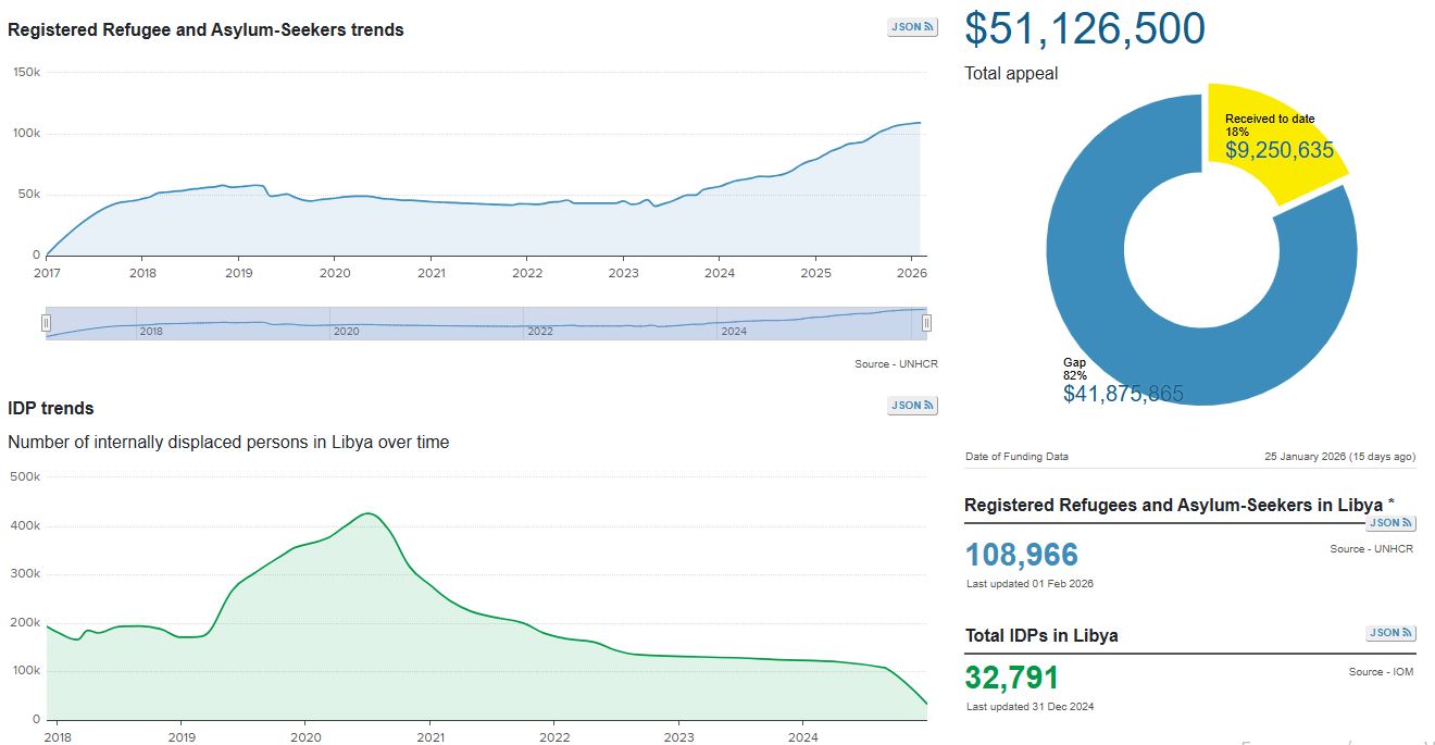 Σύμφωνα με τα στοιχεία της Ύπατης Αρμοστείας του ΟΗΕ για τους Πρόσφυγες (UNHCR), έως την 1η Φεβρουαρίου 2026 είχαν καταγραφεί στη Λιβύη περισσότεροι από 108.966 πρόσφυγες και αιτούντες άσυλο.
