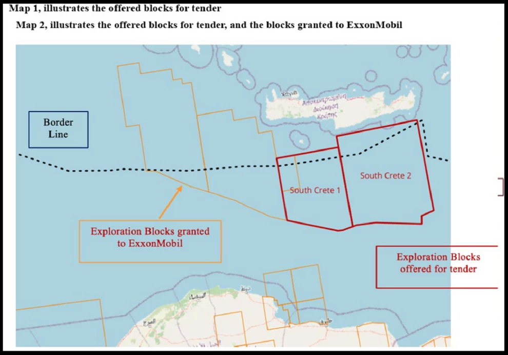 - Αξίζει να σημειωθεί ότι η Κυβέρνηση της Ελλάδας έχει παραχωρήσει δύο οικόπεδα εντός των λιβυκών θαλάσσιων συνόρων στις εταιρείες Total και ExxonMobil (χάρτης 2).* Η ExxonMobil στη συνέχεια εξαγόρασε το μερίδιο της Total και προχώρησε σε ερευνητικές δραστηριότητες, περιλαμβανομένης δισδιάστατης σεισμικής έρευνας το 2022 και τρισδιάστατης το 2024, ενώ ανακοίνωσε πρόθεση για διεξαγωγή ερευνητικής γεώτρησης.