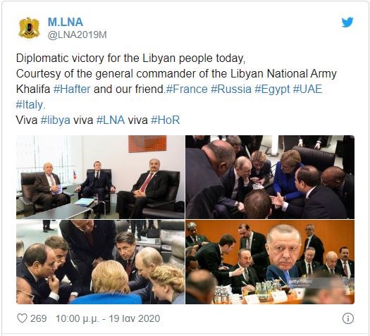 Για διπλωματική νίκη της Λιβύης στη Διάσκεψη του Βερολίνου γίνεται λόγος σε tweet που έγινε πριν από λίγο στον λογαριασμό του “Μ.LNA”, που συνιστά τη “φωνή” του στρατηγού, Χαλίφα Χαφτάρ και των δυνάμεων του.Σύμφωνα, λοιπόν, με την ανάρτηση, ο Χαφτάρ πανηγυρίζει για όλα όσα έγιναν στο Βερολίνο και ευχαριστεί τους φίλους του, ενώ δεν αναφέρει κάτι για την Ελλάδα την οποία επισκέφθηκε πριν το κρίσιμο ταξίδι του στο Βερολίνο και είχε μια σειρά από επαφές.