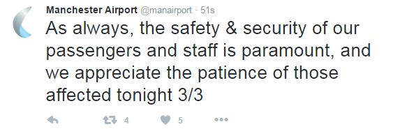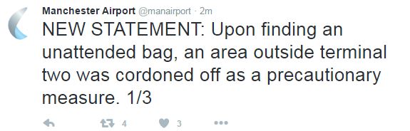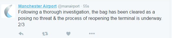 Λήξη συναγερμού για το αεροδρόμιο του Μάντσεστερ. Έπειτα από την έρευνα που πραγματοποίησε η αστυνομία στην ύποπτη τσάντα η οποία εντοπίστηκε στην πύλη 2, η περιοχή είναι ασφαλής, όπως ανακοίνωσαν οι υπεύθυνοι του αεροδρομίου μέσω twitter.