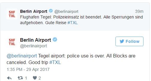 Έληξε ο συναγερμός στο αεροδρόμιο του Βερολίνου μετά τον εντοπισμό ύποπτου αντικειμένου.Σύμφωνα με ανακοίνωση του αεροδρομίου, στον τερματικό σταθμό Β’ εντοπίστηκε ασυνόδευτη βαλίτσα.Στο σημείο έσπευσαν αστυνομικές δυνάμεις, όμως μετά από έλεγχο διαπιστώθηκε ότι δεν υπήρχε κίνδυνος.Το αεροδρόμιο σε ανακοίνωση που εξέδωσε ζήτησε συγγνώμη από τους επιβάτες και τονίζει ότι ίσως υπάρξουν κάποιες αλλαγές στον προγραμματισμό των πτήσεων, λόγω του περιστατικού.