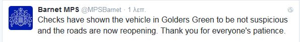 Λήξη συναγερμού στο βόρειο Λονδίνο. Σύμφωνα με μήνυμα της αστυνομίας στο Twitter, το όχημα που εντοπίστηκε έξω από το σταθμό Γκόλντερς Γκριν του μετρό ελέγχθηκε και δεν κρίθηκε ύποπτο.
