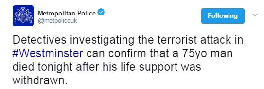 Κατέληξε σε νοσοκομείο του Λονδίνου ένας 75χρονος άνδρας ο οποίος είχε τραυματιστεί στην χθεσινή επίθεση στο Ουεστμίνστερ του Λονδίνου, αυξάνοντας τον απολογισμό των θυμάτων σε τέσσερα, ανακοίνωσε η Σκότλαντ Γιαρντ.