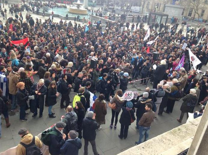 Ο κόσμος ανταποκρίθηκε στο κάλεσμα που έγινε μέσω των social media και συγκεντρώθηκε στην πλατεία Trafalgar κρατώντας πανό και φωνάζοντας συνθήματα.