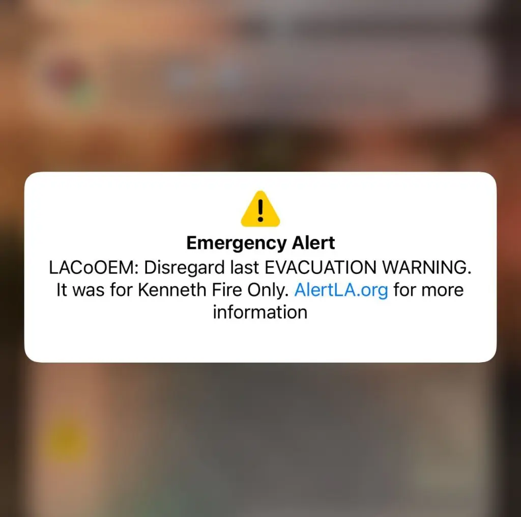 Η Χαν εξήγησε ότι η ειδοποίηση προοριζόταν αποκλειστικά για τις περιοχές που επηρεάζονται από την «Kenneth Fire» στο Γούντλαντ Χιλς. Πράγματι, λίγα λεπτά αργότερα στάλθηκε διορθωτική ειδοποίηση: «Αγνοήστε την προηγούμενη προειδοποίηση εκκένωσης. Αφορούσε μόνο τη φωτιά Kenneth».