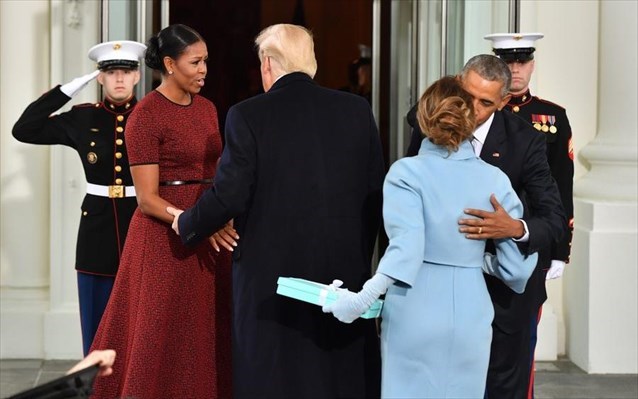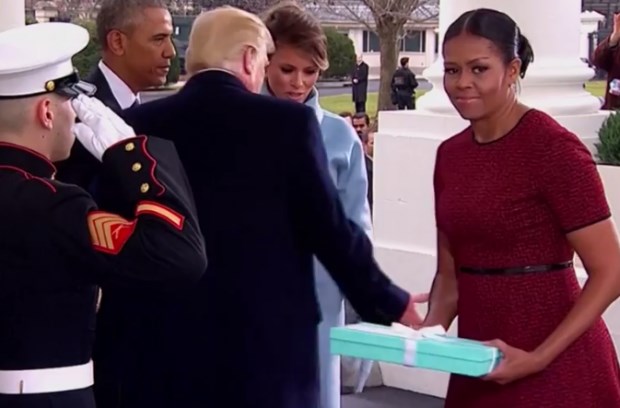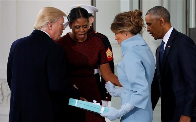 Η αμήχανη έκφραση της Μισέλ Ομπάμα την ώρα που της παρέδιδε η Μελάνια Τραμπ το μεγάλο κουτί έγινε meme στο διαδίκτυο.