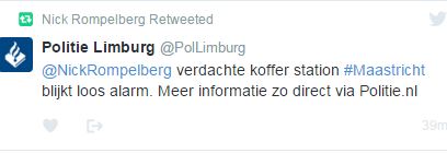 «Εσφαλμένος συναγερμός». Αυτή την ανάρτηση έκανε πριν λίγο η αστυνομία του Μάαστριχτ στο λογαριασμό της στο Twitter για το σκηνικό, που στήθηκε πριν λίγη ώρα στον τοπικό σιδηροδρομικό σταθμό.