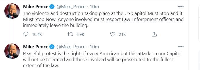 Αφού οι διαδηλωτές εισέβαλαν στο Καπιτώλιο, ο αντιπρόεδρος Μάικ Πενς που φυγαδεύτηκε για την προσωπική του ασφάλεια, απηύθυνε μήνυμα ώστε να σταματήσει η βία και οι άνθρωποι να σεβαστούν τον νόμο και να εγκαταλείψουν το κτίριο. “Η βία και η καταστροφή που συμβαίνουν τώρα στο Καπιτώλιο πρέπει να σταματήσει και να σταματήσει τώρα. Όποιος εμπλέκεται πρέπει να σεβαστεί τις δυνάμεις επιβολής του νόμου και να εγκαταλείψουν αμέσως το κτίριο.” έγραψε αρχικά σε ανάρτησή του και πρόσθεσε: Οι ειρηνικές διαδηλώσεις είναι δικαίωμα κάθε Αμερικανού αλλά αυτή η επίθεση στο Καπιτώλιο δεν θα γίνει ανεχτή και όσοι εμπλέκονται θα διωχθούν στον μέγιστο βαθμό του νόμου” επεσήμανε ο αντιπρόεδρος των ΗΠΑ.