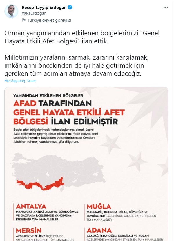 Ο πρόεδρος Ρετζέπ Ταγίπ Ερντογάν ανακοίνωσε ότι οι περιοχές που επλήγησαν από δασικές πυρκαγιές στην Αττάλεια, τη Μούγλα, τη Μερσίνα, τα Άδανα και την Οσμανιέ έχουν ανακηρυχθεί ως κατεστραμμένες περιοχές.