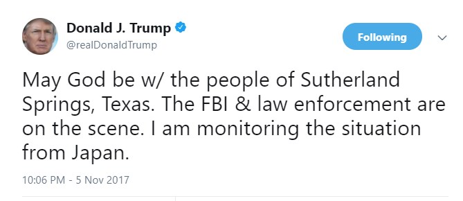 Τραμπ: “Επιβλέπω την κατάσταση από την Ιαπωνία”«Ο Θεός ας είναι μαζί με τους ανθρώπους του Σάδερλαντ Σπρινγκς, Τέξας. Το FBI και η αστυνομία βρίσκονται επί τόπου. Επιβλέπω την κατάσταση από την Ιαπωνία», έγραψε στο Twitter ο Αμερικανός πρόεδρος Ντόναλντ Τραμπ για το μακελειό στο Τέξας, από την Ιαπωνία όπου βρίσκεται σε επίσημη επίσκεψη.