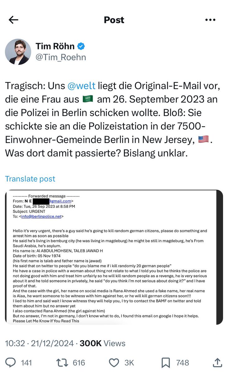 «Με τραγικό τρόπο, εμείς στο @welt έχουμε το πρωτότυπο email που μια γυναίκα από τη Σαουδική Αραβία σκόπευε να στείλει στην αστυνομία του Βερολίνου στις 26 Σεπτεμβρίου 2023. Ωστόσο, το έστειλε κατά λάθος σε ένα αστυνομικό τμήμα της κοινότητας των 7.500 ατόμων του Βερολίνου στο Νιου Τζέρσεϊ. Το τι συνέβη σε αυτό εκεί παραμένει ασαφές», γράφει στην ανάρτησή του.