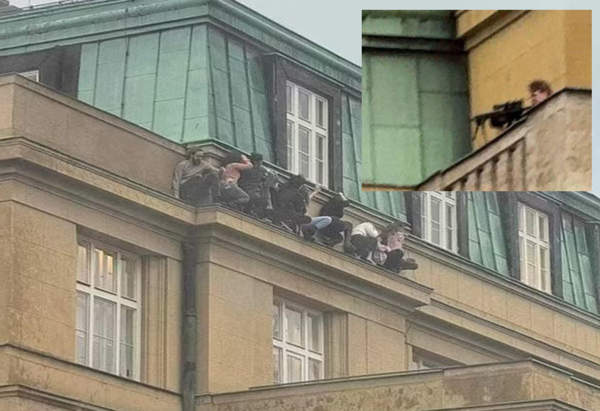 Students at Charles University in #Prague on the roof of a building where they are trying to hide from a gunman. pic.twitter.com/rqAlERCsr2