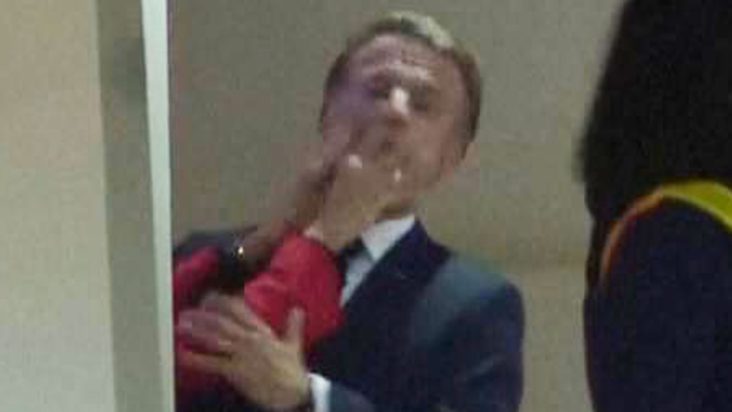 Στο πλάνο, η Μπριζίτ Μακρόν διακρίνεται να υψώνει απότομα το χέρι προς το πρόσωπό του, με τον ίδιο να φαίνεται έκπληκτος.