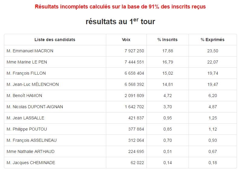 Σύμφωνα με τα τελευταία αποτελέσματα του υπουργείου Εσωτερικών της Γαλλίας, στο 91% της καταμέτρησης επί των εγγεγραμμένων ψηφοφόρων, ο Μακρόν συγκεντρώνει το 23,50% των ψήφων, ενώ η Λεπέν λαμβάνει το 22,07%.