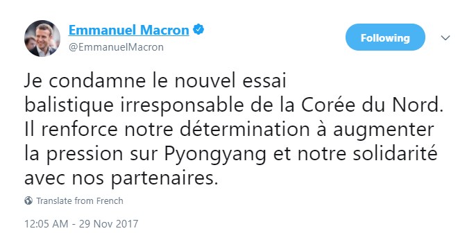 «Καταδικάζω τη νέα ανεύθυνη δοκιμή βαλλιστικού πυραύλου της Βόρειας Κορέας, μια ενέργεια η οποία ενισχύει την αποφασιστικότητά μας να εντείνουμε την πίεση στην Πιονγκγιάνγκ και την αλληλεγγύη μας στους εταίρους μας», έγραψε ο Μακρόν στον λογαριασμό του στο Twitter.
