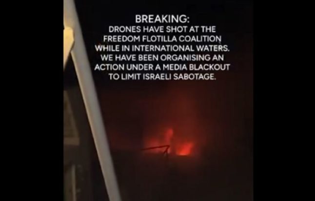 BREAKING: At 00:23 Maltese time, a #FreedomFlotilla ship was subjected to a drone attack. The front of the vessel was targeted twice, resulting in a fire and a breach in the hull. The ship is currently located in international waters near #Malta. An #SOS distress signal was sent. pic.twitter.com/J6oEQafuOb
