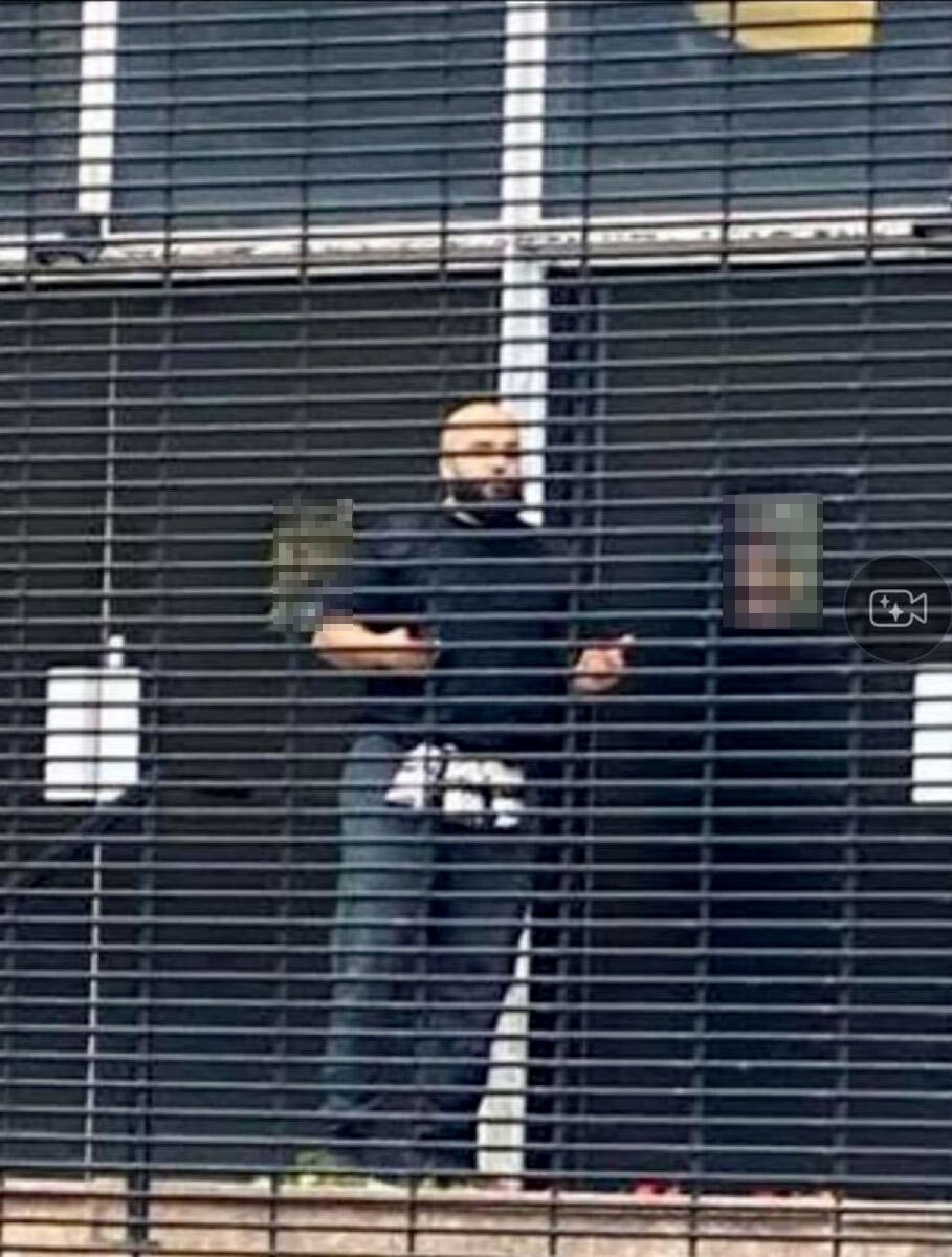 Στο πλάνο, που φαίνεται να τραβήχτηκε από περαστικό, δύο ένοπλοι αστυνομικοί στέκονται και σημαδεύουν με τα όπλα τους ένα άτομο που βρίσκεται ξαπλωμένο στο έδαφος.