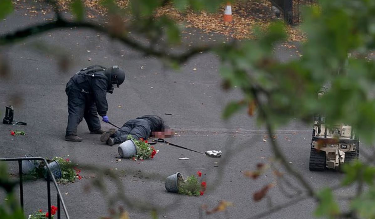 Η εικόνα του δράστη, η οποία επαληθεύτηκε από το BBC, τραβήχτηκε ακριβώς έξω από τον περιμετρικό φράχτη της σκηνής το πρωί της Πέμπτης. Μια φωτογραφία από τη σκηνή δείχνει το σώμα του δράστη να εξετάζεται από πυροτεχνουργό.