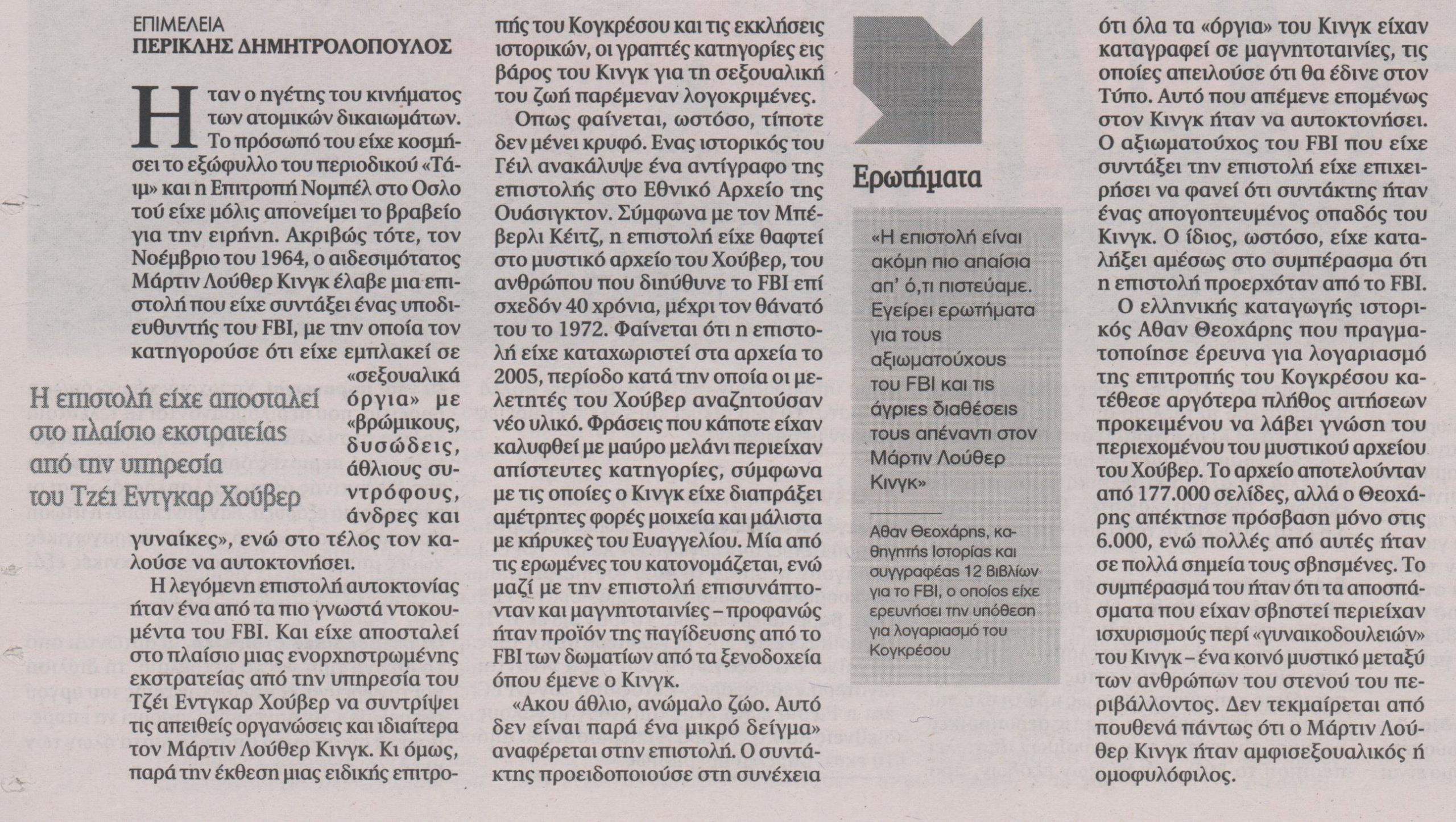 Η λεγόμενη επιστολή αυτοκτονίας ήταν ένα από τα πιο γνωστά ντοκουμέντα του FBI. Και είχε αποσταλεί στο πλαίσιο μιας ενορχηστρωμένης εκστρατείας από την υπηρεσία του Τζέι Έντγκαρ Χούβερ να συντρίψει τις απειθείς οργανώσεις και ιδιαίτερα τον Μάρτιν Λούθερ Κινγκ. Κι όμως, παρά την έκθεση μιας ειδικής επιτροπής του Κογκρέσου και τις εκκλήσεις ιστορικών, οι γραπτές κατηγορίες εις βάρος του Κινγκ για τη σεξουαλική του ζωή παρέμεναν λογοκριμένες.