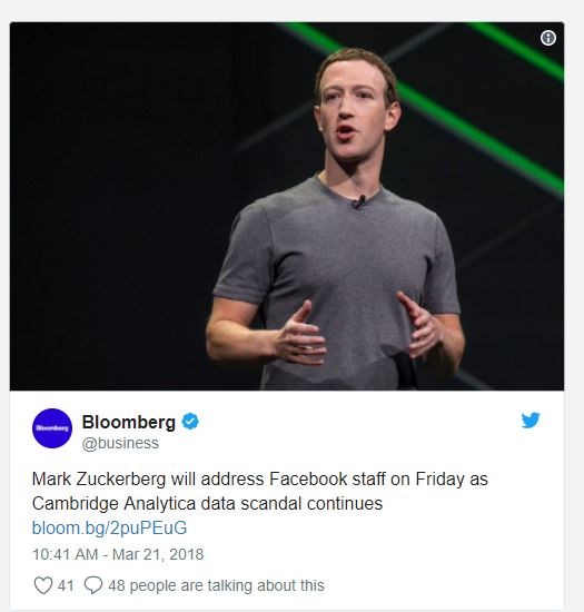 Η εταιρεία του Μαρκ Ζάκερμπεργκ ανακοίνωσε ότι είναι «σοκαρισμένη που εξαπατήθηκε» γα τη χρήση προσωπικών δεδομένων των χρηστών της από την Cambridge Analytica και τόνισε ότι «κατανοεί τη σοβαρότητα του προβλήματος».