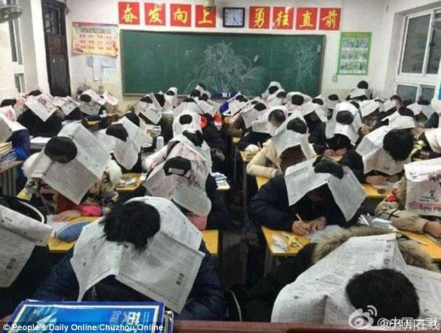 Σύμφωνα με το People’s Daily Online, οι μαθητές ενός σχολείου στην επαρχία Anhui της ανατολικής Κίνας, αναγκάστηκαν να φορέσουν εφημερίδες πάνω στο κεφάλι τους, έτσι ώστε να μην μπορούν να κοιτούν τριγύρω τους.