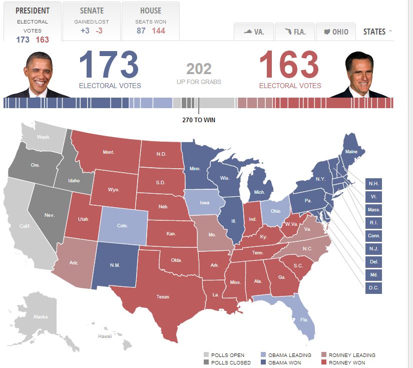 Συνεχίζεται το θρίλερ σε Οχάιο και Φλόριντα για τις αμερικανικές προεδρικές εκλογές. Στην Πολιτεία του Οχάιο ο Μπάρακ Ομπάμα προηγείται, μέχρι στιγμής με 50,3%, έναντι 48,1% του Μιτ Ρόμνεϊ.