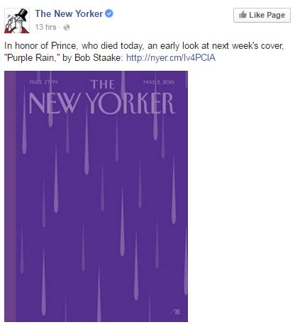 Στη μνήμη του Prince που έφυγε ξαφνικά από τη ζωή, θα είναι αφιερωμένο το εξώφυλλο του επόμενου τεύχους, του περιοδικού New Yorker. Στην επίσημη σελίδα του στο Facebook, το περιοδικό δημοσιοποίησε το εξώφυλλο του τεύχους της επόμενης εβδομάδας, το οποίο είναι μωβ και παραπέμπει στο Purple Rain, τη μεγάλη επιτυχία του Prince.