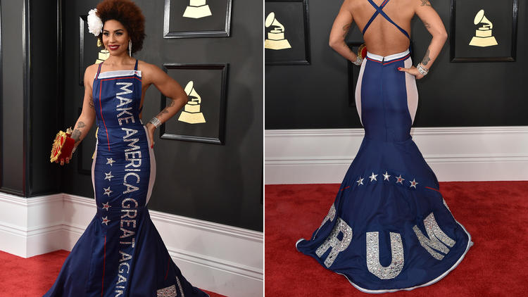 Την ώρα που στις ΗΠΑ αναζητείται ακόμη και φόρμουλα καθαίρεσης του Ντόναλντ Τραμπ από την προεδρία μετά το ξενοφοβικό διάταγμα για τους μουσουλμάνους, ο νέος Πρόεδρος είδε το βασικό προεκλογικό του σύνθημα να κοσμεί φόρεμα τραγουδίστριας που βρέθηκε στα βραβεία Grammy.