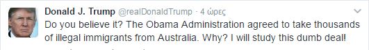 Ο Τραμπ έγραψε μάλιστα στο Twitter: «Το πιστεύετε; Η διοίκηση Ομπάμα συμφώνησε να πάρει χιλιάδες παράνομους μετανάστες από την Αυστραλία. Γιατί; Θα μελετήσω αυτή τη χαζή συμφωνία».