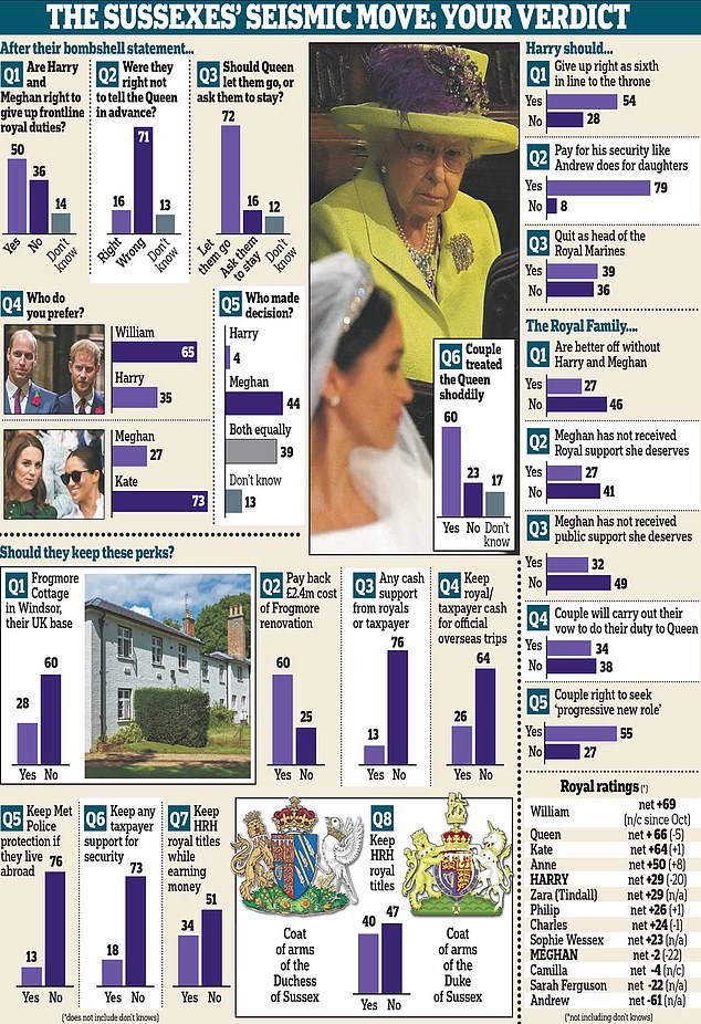 Ωστόσο στην ερώτηση αν η βασιλική οικογένεια θα είναι καλύτερα χωρίς το ζεύγος των Σάσσεξ οι Βρετανοί απαντούν σε ποσοστό 46% «όχι».