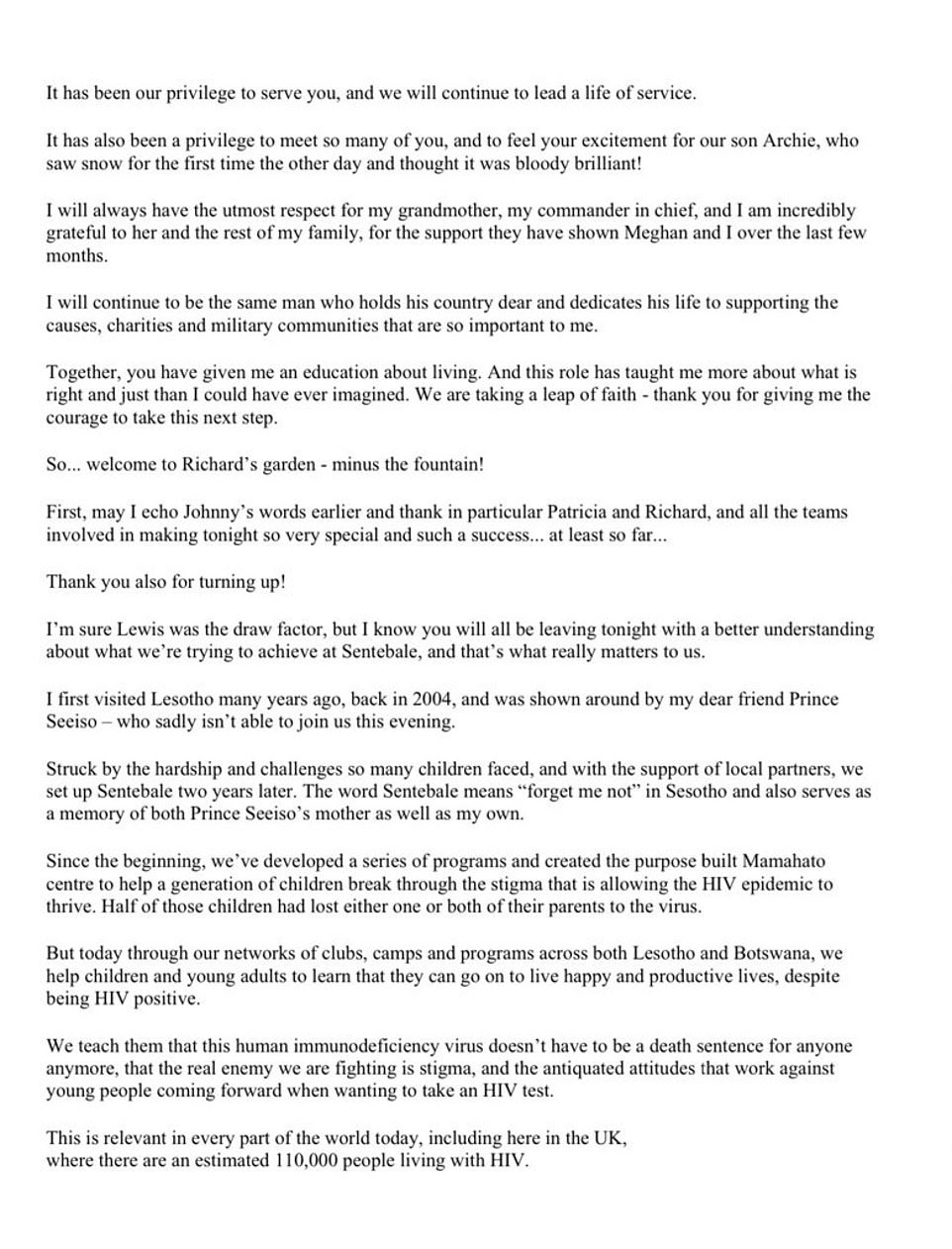 Κατά τη διάρκεια ομιλίας του τόνισε “πριν ξεκινήσω, πρέπει να πω ότι μπορώ μόνο να φανταστώ τι μπορεί να έχετε ακούσει ή διαβάσει τις τελευταίες εβδομάδες. Έτσι, θέλω να ακούσετε την αλήθεια από εμένα, όσα μπορώ να μοιραστώ, όχι ως πρίγκιπας ούτε ως δούκας αλλά ως Χάρι, το ίδιο πρόσωπο που πολλοί από εσάς είδατε να μεγαλώνει τα τελευταία 35 χρόνια – αλλά με μια πιο ξεκάθαρη οπτική”.