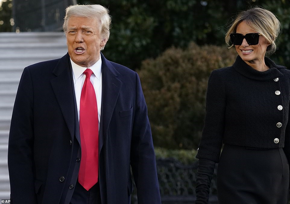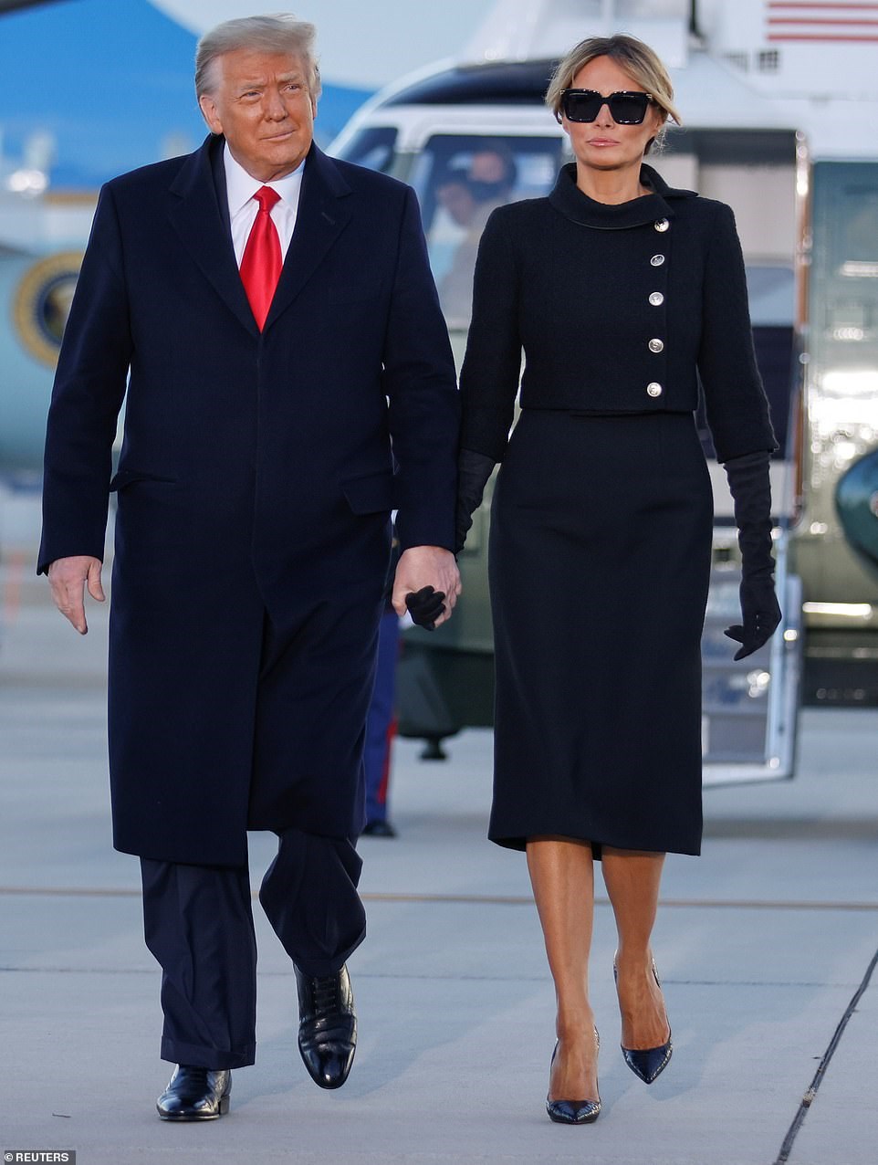 Καθηλωτική ήταν η εμφάνιση της Μελάνια Τραμπ στην τελευταία της υποχρέωση ως Πρώτη Κυρία των ΗΠΑ. Βγήκε από τον Λευκό Οίκο λαμπερή σαν αστέρας του Χόλιγουντ ντυμένη στα ολόμαυρα, με μαύρα γάντια, μαύρα γυαλιά και μία τσάντα Hermes Birkin, αξίας μεγαλύτερης των 50.000 δολαρίων. Κρατώντας αυτήν τη φορά το χέρι του συζύγου της απηύθυναν έναν σύντομο χαιρετισμό στους δημοσιογράφους προτού μπουν στο Marine One,το ελικόπτερο το οποίο τους μετέφερε στη Βάση Αντριους για την αποχαιρετιστήρια ομιλία του Τραμπ. Εκεί κάποια λόγια είπε και η Μελάνια. Έβγαλε τα μαύρα γυαλιά της και στάθηκε μπροστά στο μικρόφωνο ευχαριστώντας τον λαό της Αμερικής για την αγάπη και τη στήριξη. Έστειλε τις ευχές της και στάθηκε στην άκρη.