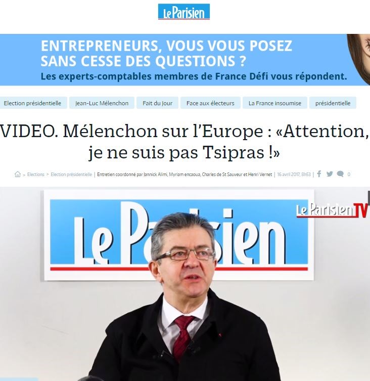 “Εγώ δεν είμαι ο Αλέξης Τσίπρας, δεν διαπραγματεύομαι 17 ώρες με ανθρώπους που με προσβάλλουν” δήλωσε ο υποψήφιος πρόεδρος της Γαλλίας, με τη σημαία της ριζοσπαστικής Αριστεράς, Ζαν-Λουκ Μελανσόν, μιλώντας στον ιστότοπο της γαλλικής εφημερίδας Le Parisien.”Εγώ εκπροσωπώ τη Γαλλία” πρόσθεσε ο κ. Μελανσόν ενώ επεσήμανε ότι “οι Γερμανοί δεν έχουν δει ποτέ απέναντί τους μια Γαλλία η οποία να τους λέει όχι”.