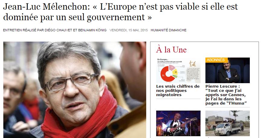 Η Ελλάδα μετατράπηκε σε ένα οικονομικό εργαστήριο που χρησιμοποιείται ως παράδειγμα για να δείχνουν “πως αντιμετωπίζονται αυτοί που αντιστέκονται!”, δηλώνει ο Ζαν-Λικ Μελανσόν σε συνέντευξή του στην γαλλική εφημερίδα “l’Humanite”.