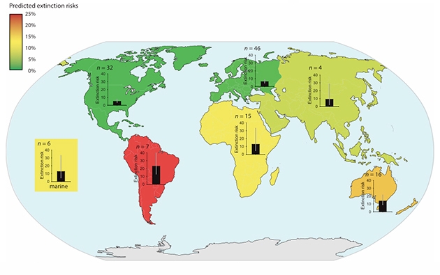 Στο άλλο άκρο της λίστας επικινδυνότητας είναι η Νότια Αμερική, η οποία ενδέχεται να χάσει το 23% των βιολογικών ειδών της. Στην Αυστραλία και Νέα Ζηλανδία ενδέχεται να χαθεί έως και το 14% των ειδών.
