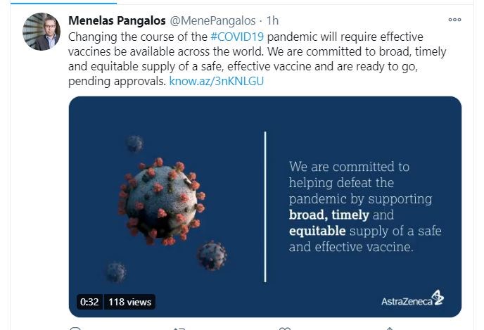 Σήμερα, μετά την ανακοίνωση της AstraZeneca για την αποτελεσματικότητα του εμβολίου της κατά του κορονοϊού, ο ίδιος ο κ. Πάγκαλος έγραψε σε ανάρτησή του στο twitter: “Η αλλαγή της πορείας της πανδημίας του Covid-19 θα απαιτήσει αποτελεσματικά εμβόλια να είναι διαθέσιμα σε κάθε γωνιά του κόσμου. Δεσμευόμαστε για ευρεία, έγκαιρη και δίκαιη παροχή ασφαλούς, αποτελεσματικού εμβολίου – είμαστε έτοιμοι να ξεκινήσουμε, περιμένουμε εγκρίσεις”