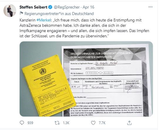 Ο Στέφεν Ζάιμπερτ είχε αναρτήσει τότε στα social media το πιστοποιητικό εμβολιασμού της Μέρκελ με τη δήλωσή της: “Είμαι χαρούμενη που εμβολιάστηκα με την πρώτη δόση της AstraZeneca σήμερα. Θα ήθελα να ευχαριστήσω όσους εμπλέκονται στην εμβολιαστική εκστρατεία και όλους όσοι εμβολιάζονται. Ο εμβολιασμός είναι το κλειδί να ξεπεράσουμε την πανδημία”.