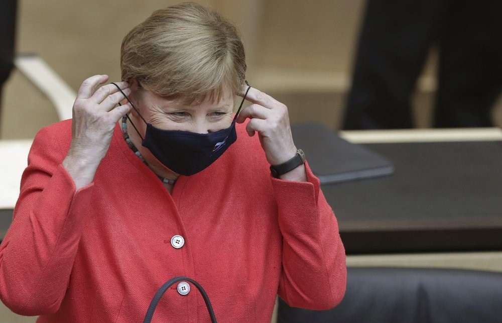 Η Μέρκελ μπήκε στην Μπούντεσρατ, την άνω βουλή του γερμανικού κοινοβουλίου, φορώντας μια μαύρη μάσκα με το σήμα EU2020.de του ιστότοπου που είναι αφιερωμένος στην εξάμηνη προεδρία της ΕΕ από την Γερμανία από την 1η Ιουλίου.
