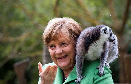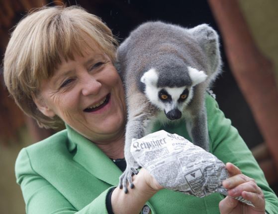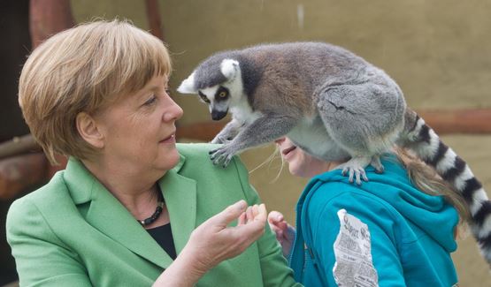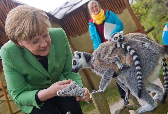 Σε ζωολογικό κήπο στην Ανατολική Γερμανία, βρέθηκε η Καγκελάριος, Άνγκελα Μέρκελ, πριν λίγες ώρες. Όπως φαίνεται και στις φωτογραφίες ένας λεμούριος την «αγάπησε», και δεν την αποχωριζόταν, καθώς συνεχώς καθόταν στον ώμο της, ενώ η χαμογελαστή, Γερμανίδα Καγκελάριος του έδινε τροφή.