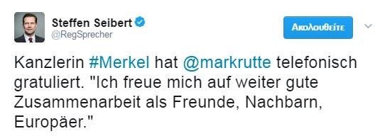 «Ανυπομονώ να συνεργαστώ μαζί σας ως φίλοι, γείτονες και Ευρωπαίοι» είπε στον Μάρκ Ρούτε η καγκελάριος της Γερμανίας Άνγκελα Μέρκελ συγχαίροντάς τον για τη νίκη του στις βουλευτικές εκλογές.