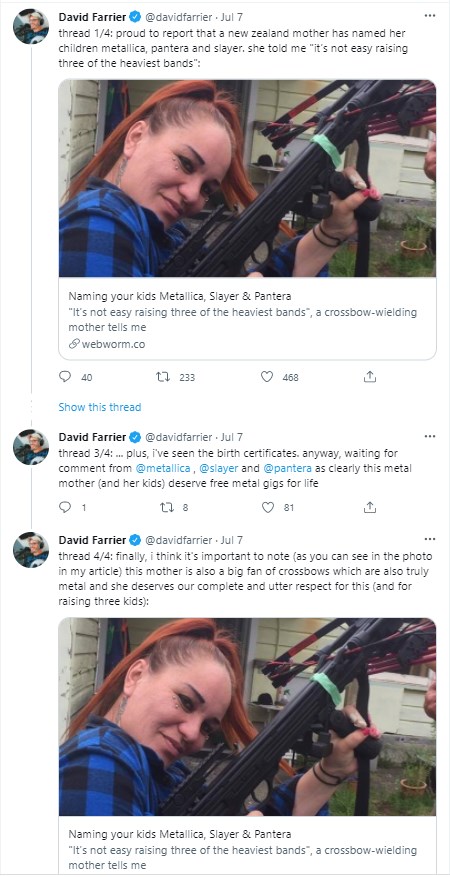Μητέρα στη Νέα Ζηλανδία φαίνεται πως είναι τόσο επηρεασμένη από τα μουσικά της ακούσματα που έδωσε τα ονόματα Metallica, Slayer και Pantera στα τρία της παιδιά.