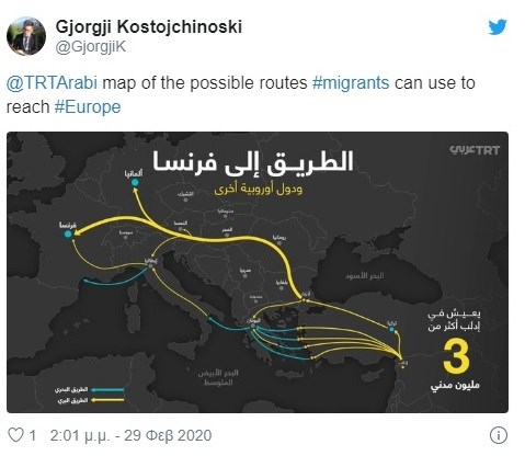 Την άμεση εμπλοκή των τουρκικών Αρχών στη δύσκολη κατάσταση που έχει δημιουργηθεί με πρόσφυγες και μετανάστες στον Έβρο και όχι μόνο αποτυπώνει η κίνηση του τουρκικού κρατικού καναλιού TRT να δημοσιεύσει χάρτη με τις διαδρομές που πρέπει να ακολουθήσουν οι μετανάστες για να μεταβούν στην Ελλάδα και από εκεί σε άλλες ευρωπαϊκές χώρες.«Χάρτης με τις πιθανές διαδρομές που μπορούν να χρησιμοποιήσουν οι μετανάστες για να φτάσουν στην Ευρώπη», αναφέρει το σχετικό μήνυμα που αναρτήθηκε στο Twitter.
