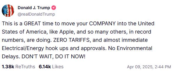 «Αυτή είναι μια μεγάλη στιγμή για να μεταφέρετε την εταιρεία σας στις Ηνωμένες Πολιτείες της Αμερικής, όπως κάνουν η Apple και τόσοι άλλοι, σε αριθμό ρεκόρ. Μηδενικοί δασμοί, και σχεδόν άμεσες συνδέσεις και εγκρίσεις ηλεκτρικής ενέργειας. Καμία περιβαλλοντική καθυστέρηση. Μην περιμένετε, κάντε το τώρα!», έγραψε στο Truth Social.