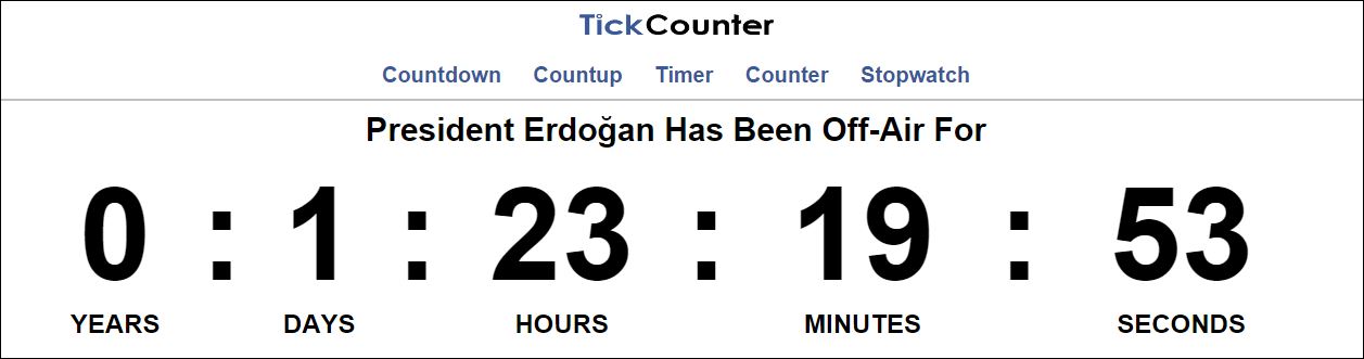 Σαστισμένοι από την ξαφνική απουσία του Ταγίπ Ερντογάν από «τον αέρα» των μέσων ενημέρωσης, μετά την απώλεια της κοινοβουλευτικής πλειοψηφίας από το κυβερνών Κόμμα Δικαιοσύνης και Ανάπτυξης, AKP, πριν από δύο ημέρες, οι Τούρκοι χρήστες των μέσων κοινωνικής δικτύωσης μοιράζονται στο Ίντερνετ ένα ρολόι που μετράει σε πραγματικό χρόνο την σιωπή του.