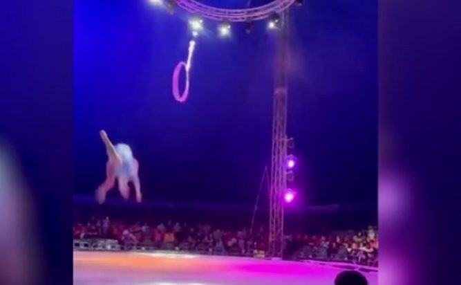 Αυτή είναι η σοκαριστική στιγμή που μια ακροβάτισσα πέφτει από εναέριο στεφάνι και χτυπά στον πάγο.