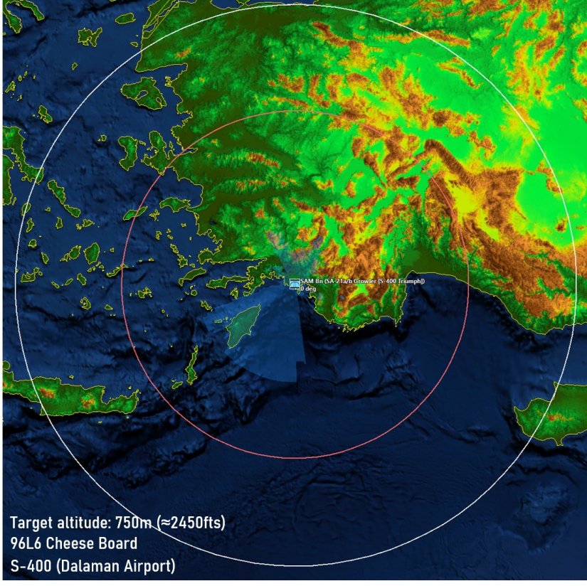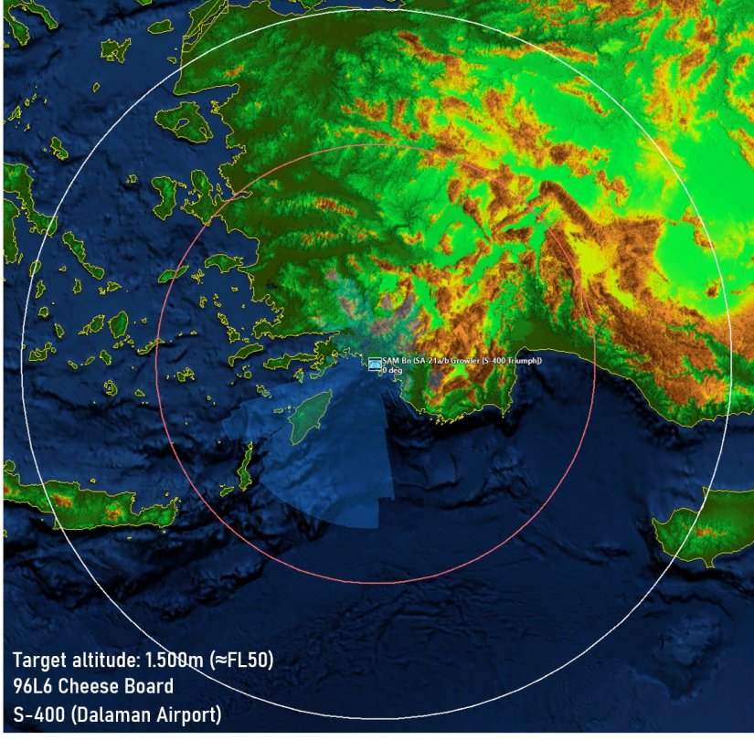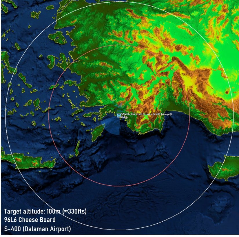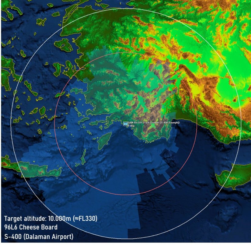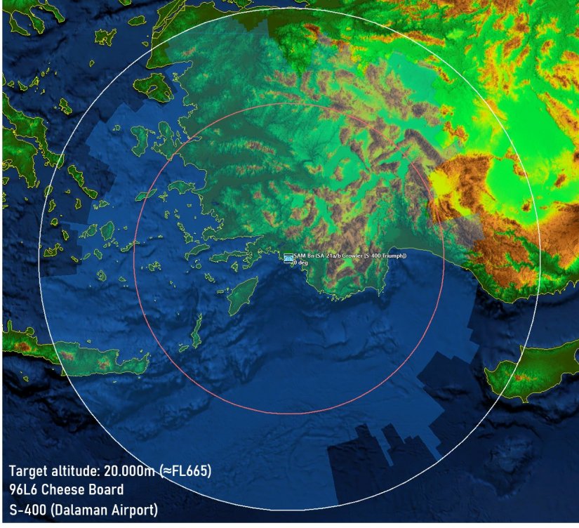Με τον κόκκινο κύκλο απεικονίζεται η εμβέλεια των βλημάτων του S-400, η οποία όμως αναγκαστικά θα επηρεαστεί από τις αντίστοιχες ικανότητες του ραντάρ, σε σχέση με το ύψος πτήσης του στόχου.
