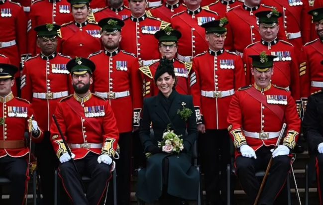 Η Κέιτ, η οποία είναι συνταγματάρχης του Ιρλανδικού Συντάγματος των Φρουρών, έχασε την ετήσια εκδήλωση της φρουράς πέρυσι, καθώς υποβαλλόταν σε θεραπεία για καρκίνο. Αλλά η Κέιτ, η οποία επιστρέφει σταδιακά στα δημόσια καθήκοντα, σήμερα ήταν παρούσα, φορώντας ένα πράσινο φόρεμα με παλτό Alexander McQueen.